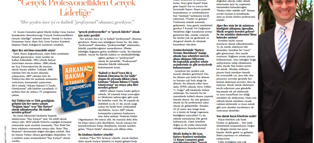 Her şeyden önce iyi ve kaliteli “profesyonel” olmamız gerekiyor. Bizim esas atladığımız husus bu. Biz daha “profesyonel” olamadan, “profesyonelliği” anlamadan, liderlik yapabileceğimizi zannediyoruz. Elbette liderliğin doğuştan gelen özellikleri vardır. Bu faktörler kritiktir. Ancak bu liderlik kalitesi ve sürdürülebilirliği, eğitim, gelişim ve “profesyonel” olmak ile paraleldir. “Profesyonel” olmadan liderlik iddiasında bulunmamak lazım. “Kaliteli ve Keyif Veren Bir iş Bulmak Dünyanın En Zor İşidir” sloganı ile piyasada dikkat çeken kitabınız “Arkana Bakma O Tarafa Gitmiyorsun” un ortaya çıkış fikri nereden geliyor? 2000’li yılların başına kadar gidiyor aslında. 40 yaşımda kitap yazacağım ve fikirlerimi anlatacağım gibi uzak bir hedefim vardı. Bu 39 yaşında da olabilirdi ya da 41 de; ancak aşağı yukarı bu hedef beni yönlendirdi diyebilirim. Ayrıca 2007 yılında konuşmalar yapmaya başlayınca olay daha netleşti. Notlarım birikti. Olgunlaşması 5-6 seneyi aldı. Bu manada dolu dolu bir kitap ortaya çıktı diyebilirim. Ancak sonuçta bir kaynak-referans kitap olmaktansa, hayatın içinden gelen, “Hayat Kitabı” olmasına çok dikkat ettim. Bu kitabınız kimlere yönelik? Kitabım 7’den 70’e herkese yönelik. Ancak kitabım daha ziyade kariyer felsefesi ve kişisel gelişim bazlı olduğu için elbette daha çok gençlere hitap ediyor. Ama benim yazarken temel amacım sadece kariyer sistemlerine girmek değildi. Makro yorumlar ve genel gidişatı da anlatmaya çalıştım. Bu manada herkese hitap ediyor diyebilirim.